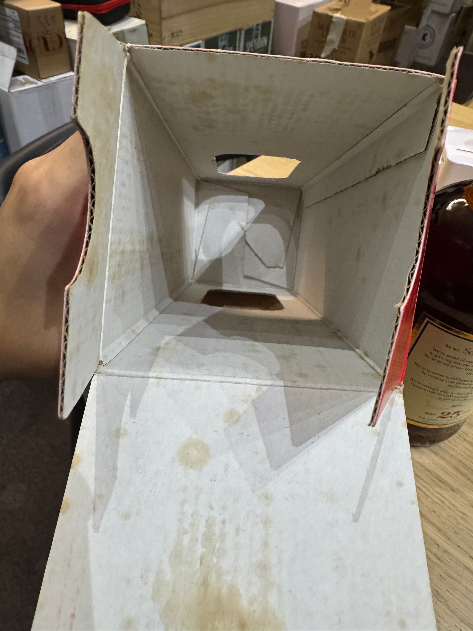 Yellow stain at the inner box >Old bottling might have broken cork, and this has some damages to the label. You can remove the cork with toothpicks or screw. Videos: HERE |